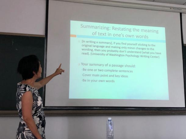 在讲座中,黄老师就提高学习外语阅读能力的七大战略:1.Activating,2. Inferring,3. Monitoring. Clarifying,4.Questioning, 5. Searching. Selecting, 6. Summarizing,7. Visualizing. Organizing等进行了详细的解答。 她逻辑清晰、论述生动有趣的讲座,高潮迭起,互动频频,受到了师生的好评。