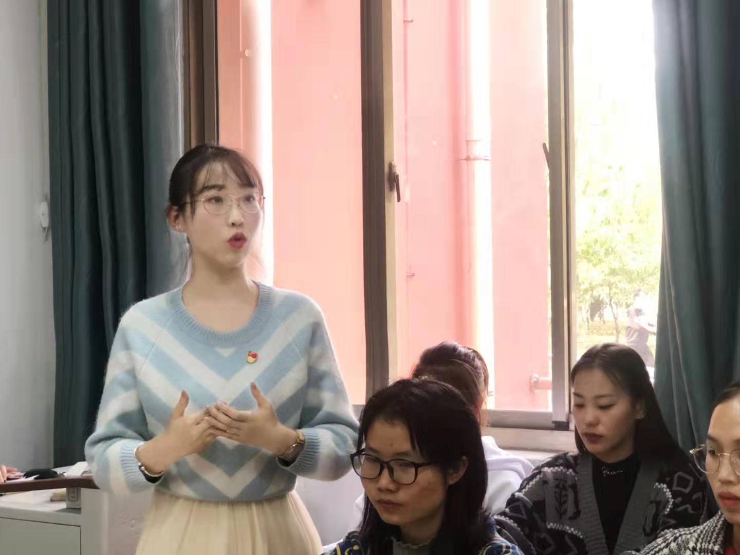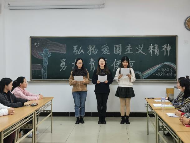团日活动通过观看短片、主题发言、诗朗诵等多个环节展开,气氛热烈活跃,班内的两位学生以电影《我和我的祖国》为切入点,表达了一代人有一代人的使命,一代人有一代人的担当,为同学们上了一堂精彩的微党课。6位发言的同学结合自己的亲身经历,有家乡精准扶贫带来的改变、参加全国英语演讲比赛的经历、在志愿服务中的历练以及通过全国英语专业四级考试的喜悦。阐释了当代青年从学习中担当、从创新中担当、从实践中担当的理想抱负。主题团日还邀请了两位研究生学姐和一位本科四年级保研的学姐。刘淑君同学给同学们讲述了自己本科毕业后参加研究生支教团,到祖国最需要的地方去的青年责任担当。董晓萌同学分享了自己在美国密苏里州立大学访学一年的见闻,让在场的同学深深感受到了祖国强大带给留学生强烈的民族荣誉感。听到林鑫同学分享的鸭奈飞