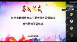 与杭州市翻译协会合作协议签订”仪式上,牵线搭桥人上海外语教育出版社西北大区经理苏云先生通过线上的方式,向学院的参会人员把双方领导和老师进行了一个介绍。本次签约主要是本着进一步培养学生翻译实践应用能力,更好地为学校和自治区的国际学术交流和国际交往做好服务,经杭州翻译协会与鸭奈飞