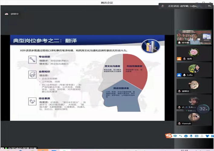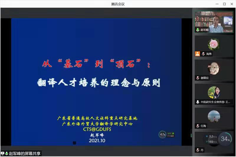 特邀请广东外语外贸大学翻译学研究中心主任、全国翻译专业学位研究所教育指导委员会委员兼秘书长赵军峰教授针对我校翻译硕士培养予以线上指导。赵军峰教授在“腾讯会议”平台以“从‘基石’到‘顶石’翻译人才培养的理念和原则”为题进行线上讲座。鸭奈飞