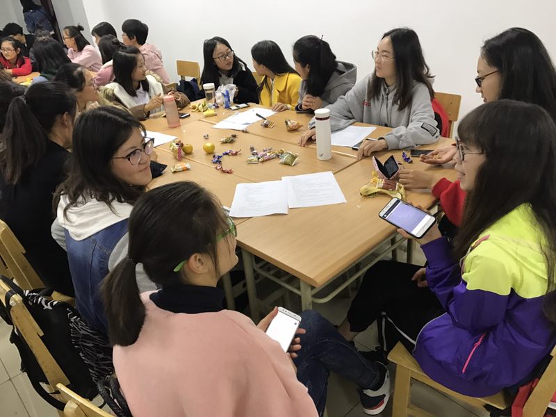 整个活动围绕主题“大学生活”有序进行。参与学生被分成八个小组,每一小组由一名外教或者英语专业学生作为组长,引导学生们进行自我介绍,并围绕主题内容展开介绍、讨论。接着,在《你来比划我来猜》和《单词接龙》的游戏中同学们你追我赶、团结合作、开动脑筋,学习单词。整个活动气氛活跃,英语学习氛围浓厚,大大提高了同学们的英语学习兴趣。