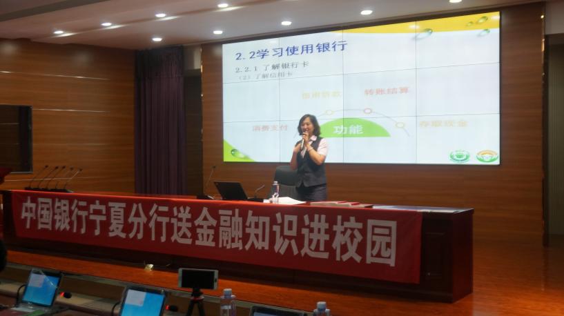 于403报告厅举办了以“金融知识进校园”为主题的新生讲座。主讲人丁玲,是中国银行宁夏分行的团委书记,曾获中国银行2012年全球业务技能大赛优秀奖,2014年中国银行总行级、宁夏区分行级优秀共青团干部,2016年中国银行宁夏区分行优秀共产党员等荣誉。鸭奈飞