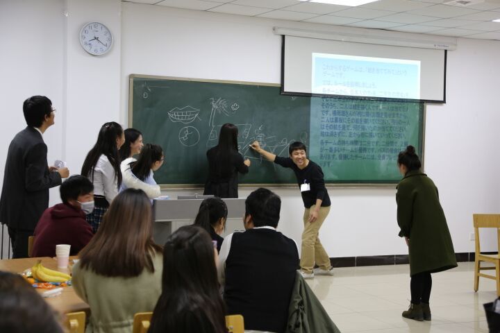 首先,日语专业二年级的同学们分为东北组和宁夏组,用日语向大家详细介绍了自己家乡的风土人情。现场的每个人跟随他们的介绍仿佛身临其境,又不禁回想起了自己的家乡;三年级的同学们则分组介绍了宁夏不同地区有趣的方言,同学们以及日本来宾都跟着学了起来,大家其乐融融。随后,同学们和日本来宾一起分组参与了“你画我猜”的游戏,气氛热烈,欢笑声不绝于耳,将日语角推向了又一个高潮。最后的自由交流时间,同学们围绕自己感兴趣的话题和日本友人进行了交流,大家侃侃而谈,聊得不亦乐乎。