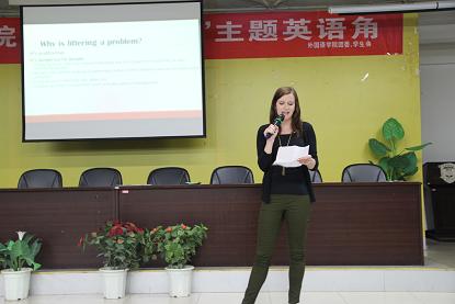 本次活动在轻松活泼的游戏中拉开帷幕,大家都积极参与到活动中来,现场爆发出阵阵欢笑声。接着,三位外教为同学们表演了关于环境保护的情景剧,并引导大家展开有关环境问题的讨论,同学们积极讨论并踊跃发言。