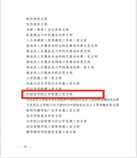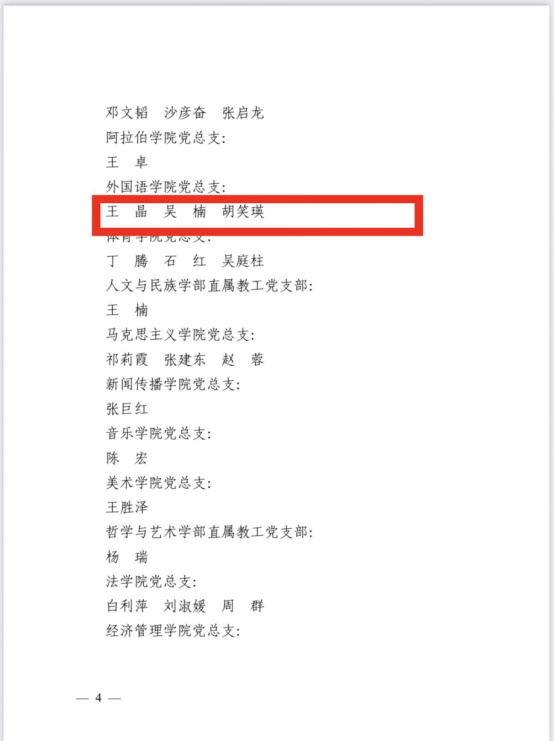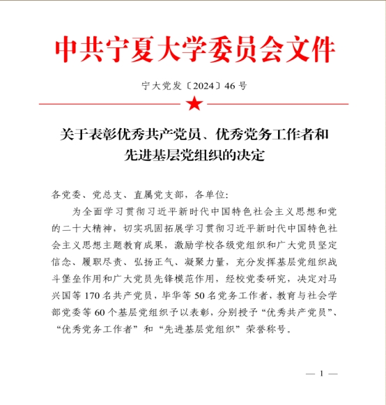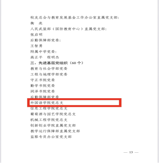 2024年6月28日,鸭奈飞 在贺兰山校区笃行楼一楼报告厅召开“七一”表彰大会,鸭奈飞 党总支、鸭奈飞 公外部教工党支部获得先进基层党组织荣誉称号,胡笑瑛、王晶、吴楠三位教师获得优秀共产党员荣誉称号。