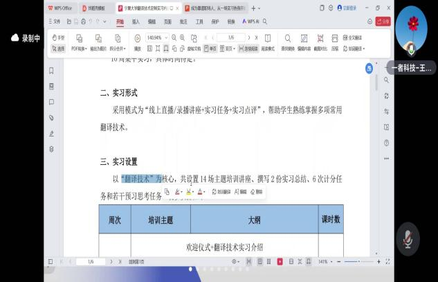 王经理为同学们详细介绍了线上翻译实习任务,同学们看到,此次为期16周的翻译实习融合了高质量讲座、直播、录播课程及大量翻译实践,学习内容丰富、练习目标清晰,定制实习将帮助同学们在信息检索、语料库制作、译后编辑、翻译项目管理等翻译技术应用方面有所补充和发现。学院期待同学们能在本次实习活动中深入理解技术素养对翻译人才专业发展的重要性,也期待外院与一者科技的协同育人实习项目取得切实成果。