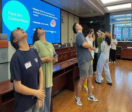 活动一开始,大家自由组成五支队伍开启当晚的娱乐游戏party,有“Grab the Bean Relay”,“Ping Pong Ball Pass”,“Face the Cookie Relay”等小游戏,每个游戏开始前,柯雷宝老师都会用英文详尽介绍游戏规则,游戏过程中大家用英文沉浸式交流互动,口语能力得到很大提升。