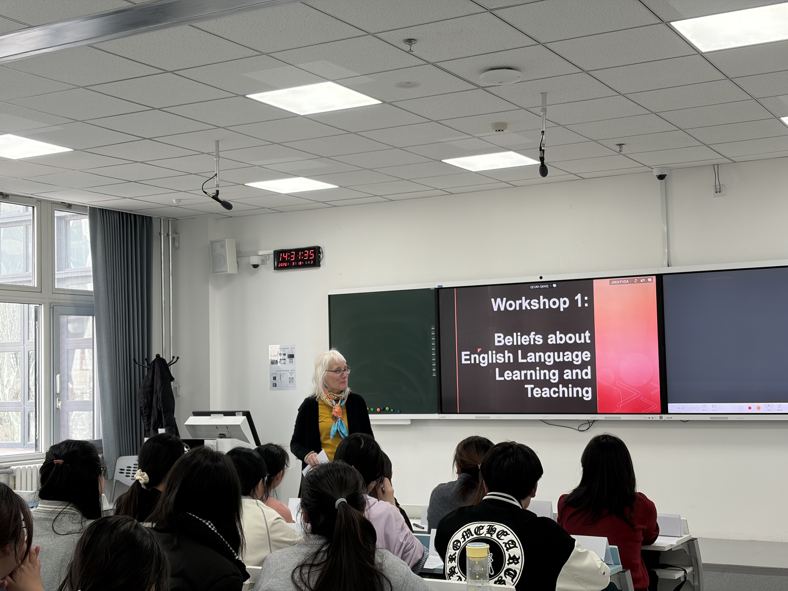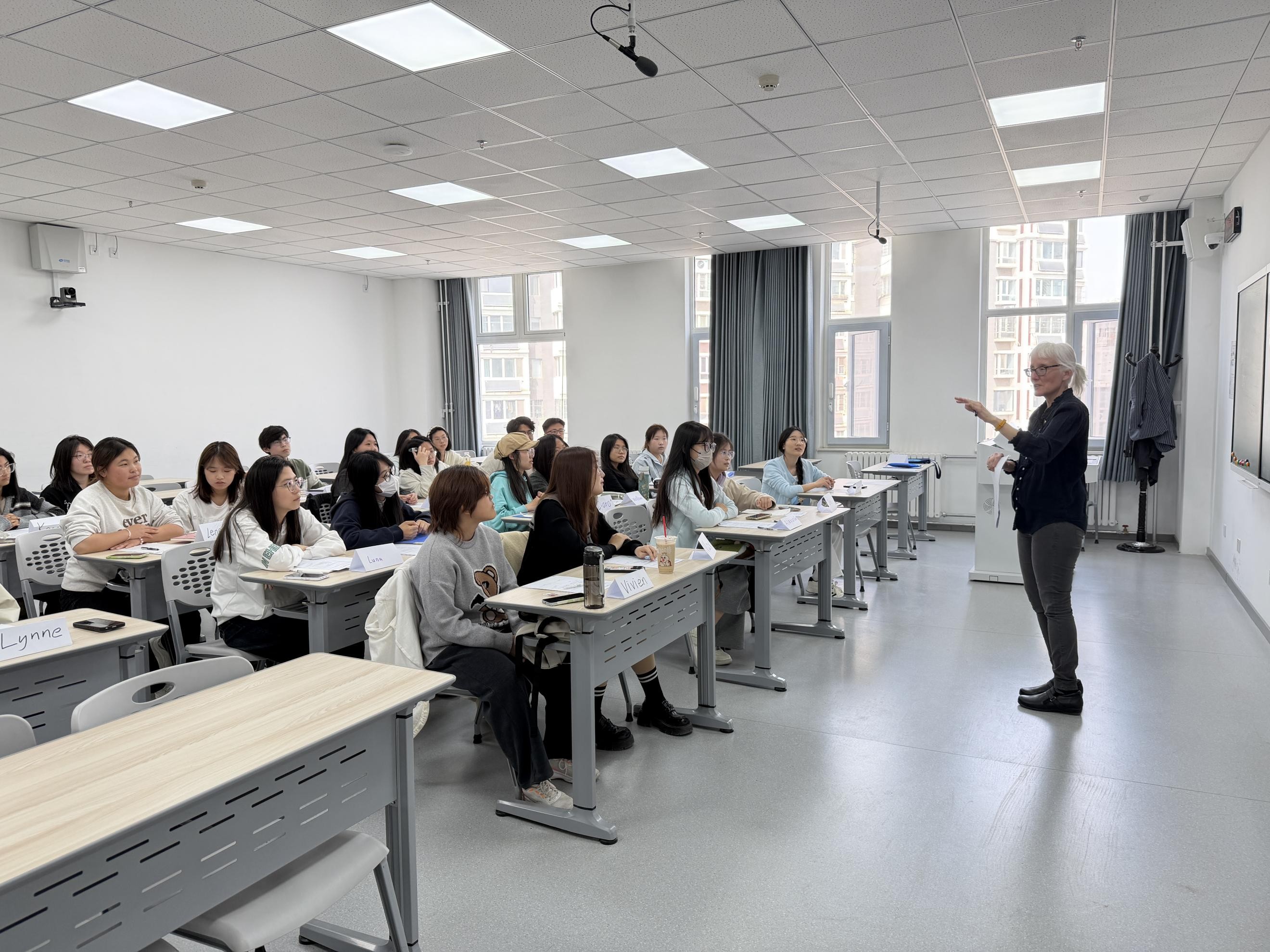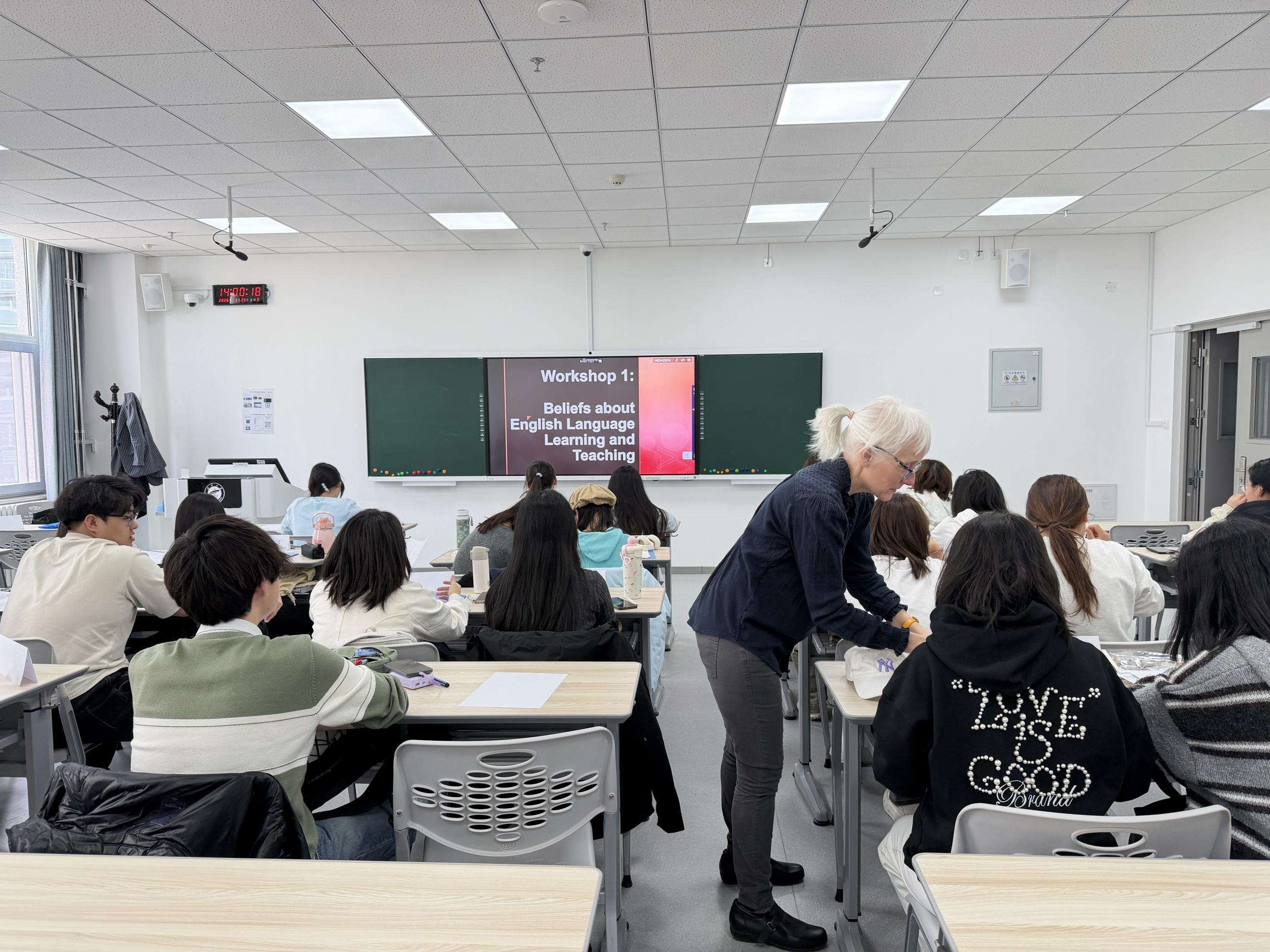 在贺兰山校区笃行楼207教室和407教室,分别为2025级英语师范1班和2班学生举办了“卓越教师培养计划”首场教学工作坊。本次工作坊以“Beliefs about English Language Teaching and Learning”为主题,特邀英语教学法领域专家Melissa K. Smith博士主讲,旨在引导未来教师审视并重构自身教与学的信念,为后续课堂实践与教学研究奠定扎实基础。