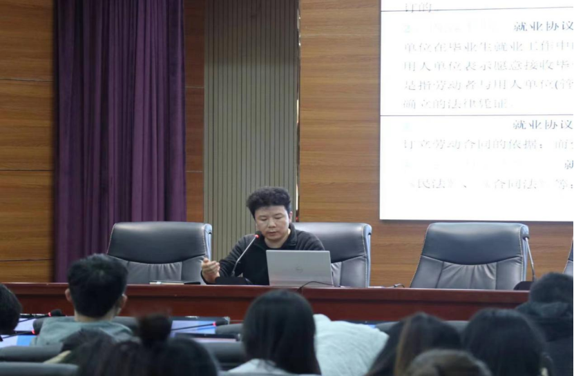 于致远楼403报告厅开展2023届毕业生就业政策及就业项目推介讲座。本次讲座由学院党委副书记郑轶主持召开,2019级本科生全体参加。