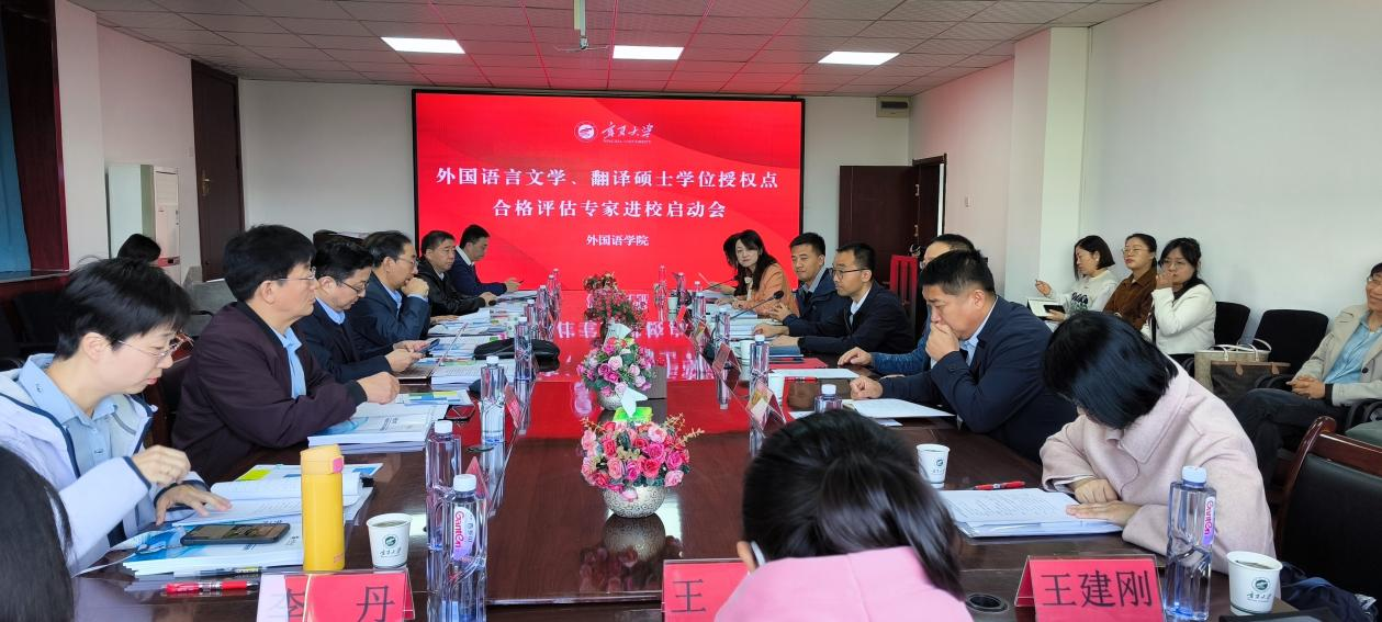 外国语言文学(0502)、翻译硕士(0551)学位授权点专家进校评审工作在怀远校区逸夫楼进行。本次评估组由上海交通大学特聘教授、国务院学位委员会第八届学科评议组成员彭青龙教授担任专家组组长,成员有全国翻译专业学位研究生教育指导委员副主任委员、广东外语外贸大学高级翻译学院赵军峰教授、国务院外国语言文学学科评议组成员、中国人民大学“杰出学者”郭英剑教授、国务院外国语言文学学科评议组成员、北京航空航天大学鸭奈飞